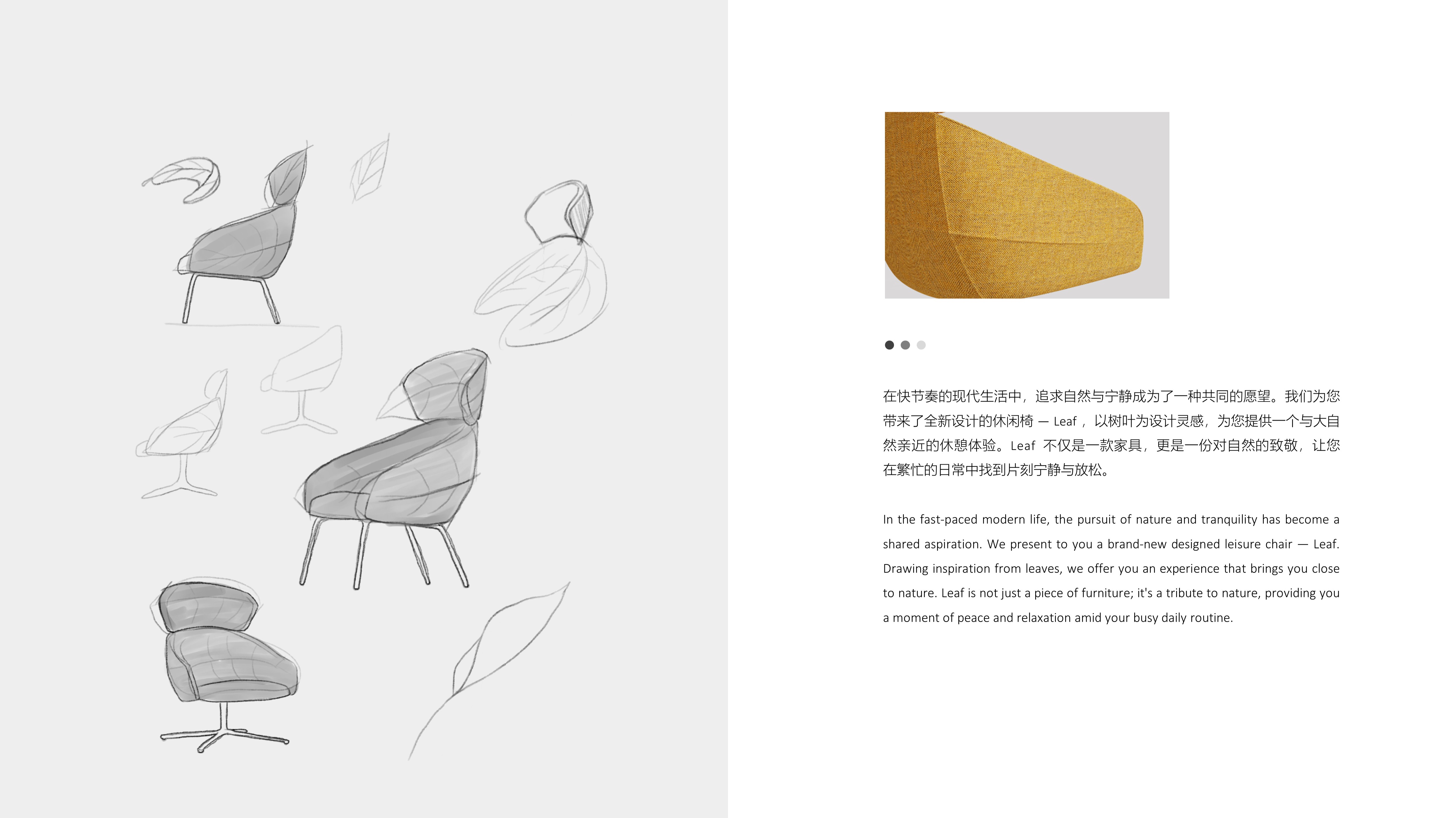 In the fast-paced modern life, the pursuit of nature and tranquility has become a shared aspiration. We present to you a brand-new designed leisure chair — Leaf. Drawing inspiration from leaves, we offer you an experience that brings you close to nature. Leaf is not just a piece of furniture; it's a tribute to nature, providing you a moment of peace and relaxation amid your busy daily routine.